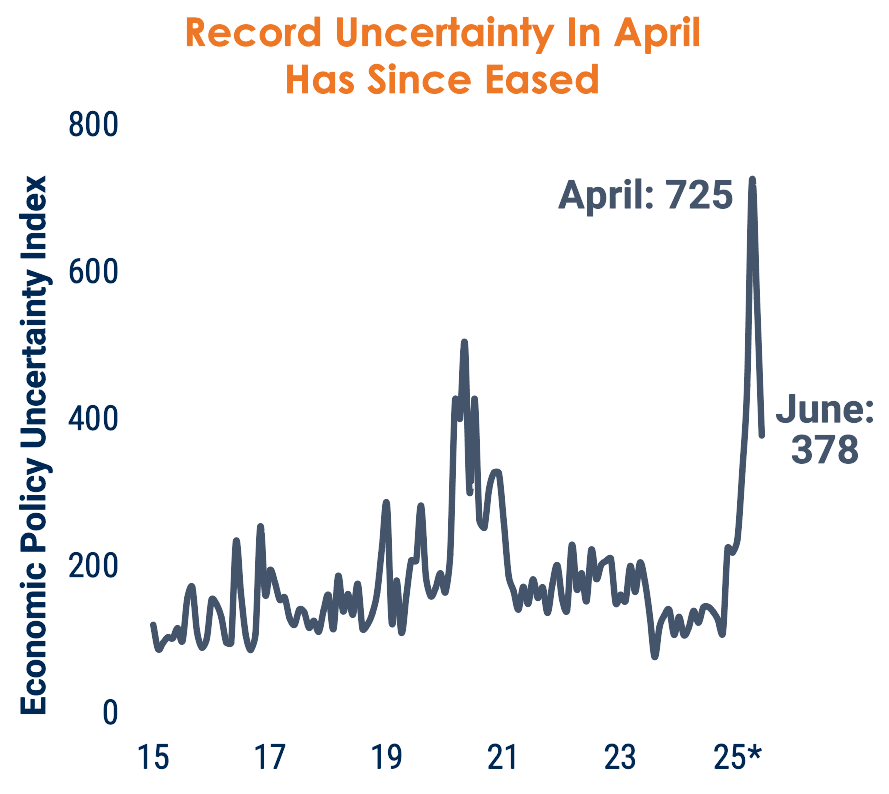 Uncertainty index plunged after April’s record spike as the 90-day tariff pause and solid data soothed nerves.